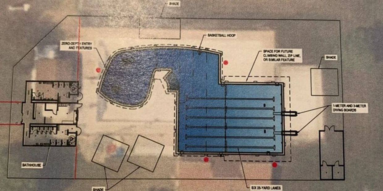 This conceptual drawing features zero entry, five competition length swimming lanes and diving boards. The main entrance and bath houses will be accessed from the parking lot on NE 2nd Street.